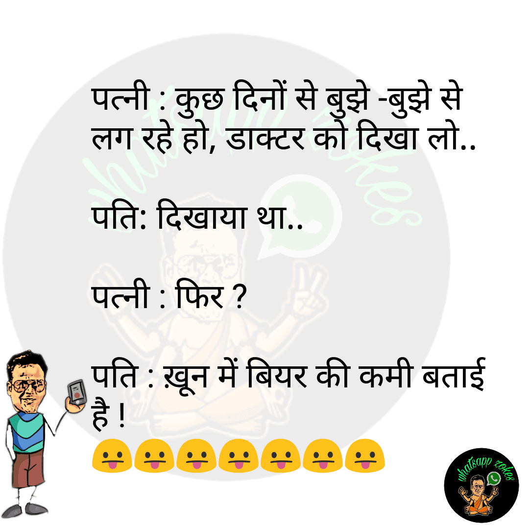 Trendingकुछ दिनों से बुझे -बुझे से लग रहे होPosted on January 16, 2018October 12, 2023zokeswhatsappCommentपत्नी : कुछ दिनों से बुझे -बुझे से लग रहे हो, डाक्टर को दिखा लो..पति: दिखाया था..पत्नी : फिर ?पति : ख़ून में बियर की कमी बताई है ! 😛😛😛😛😛😛😛 Post Views: 493
